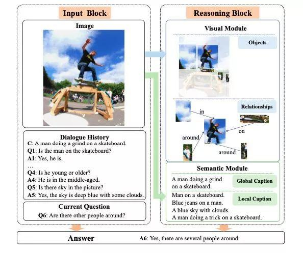 如下图 1 所示「Q1: Is the man on the skateboard?」, 需要关注「man」,「skateboard」等信息,当问题变换为「Q5: Is the sky in the picture」时,需要将关注区域转移至「sky」。问题 Q1 和 Q5 主要关注在表层(appearance-level)信息问题,而 Q4「Is he young or older」则需要进一步地视觉推理得到更高层的语义信息。因此,如何根据问题进行自适应调整并有效地捕捉视觉信息是视觉对话问题中的重要挑战之一。