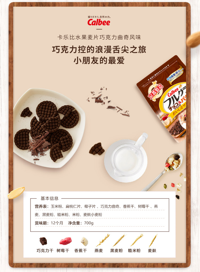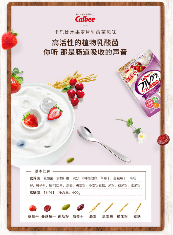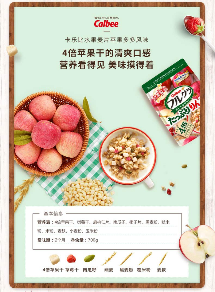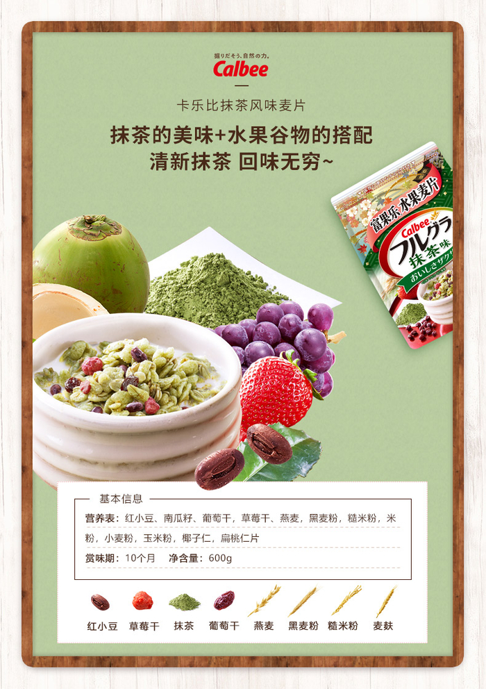 Calbee是日本销量第一的麦片,也是最好吃的麦片。经典款含有草莓干、苹果干、木瓜干、葡萄干、南瓜子、大杏仁、椰子、燕麦、黑麦粉等12种水果谷物,口感丰富,富含膳食纤维、维生素和铁物质。