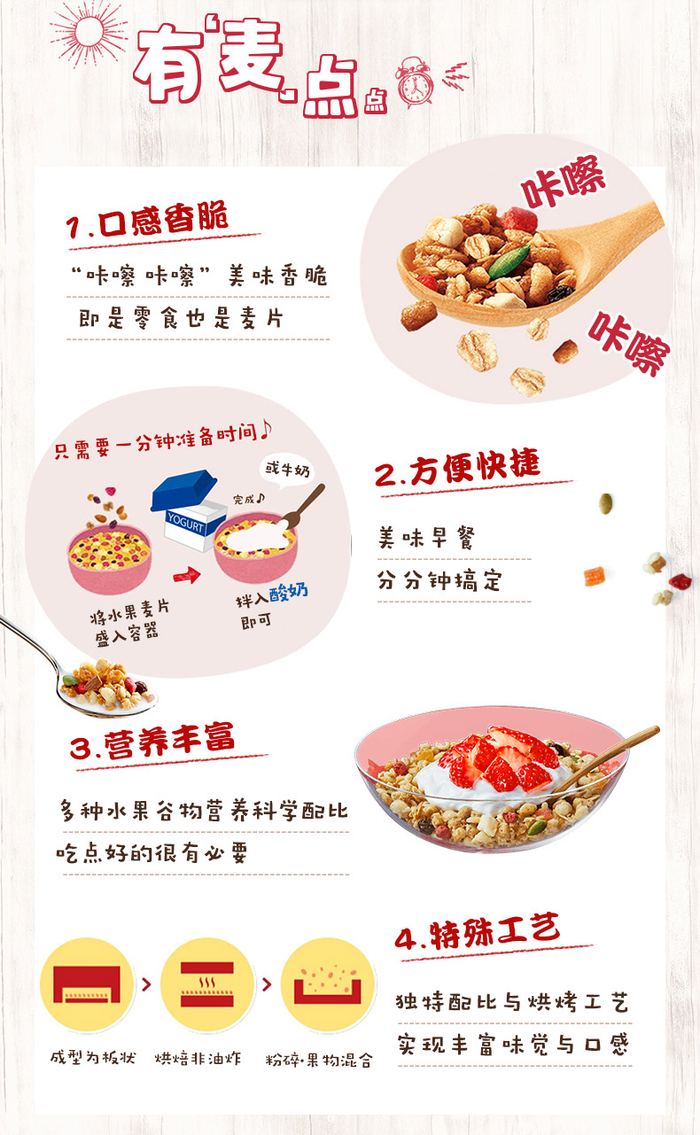 卡乐比的水果麦片非常好吃,口味丰富,可直接开袋干吃,一般作为早午餐泡牛奶、豆浆吃,泡在酸奶里也非常美味。这款麦片生产于日本北海道,非辐射污染区,同时许多原料还是进口的,安全上不用担心,国际官方旗舰店,来源渠道也有保障,可以放心食用。