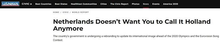 荷兰不再用“Holland”这一昵称的消息,据称来自“美国新闻及世界报导”(U.S. News & World Report)。该报在12月27日的文章《Netherlands Doesn’t Want You to Call It Holland Anymore》中称: