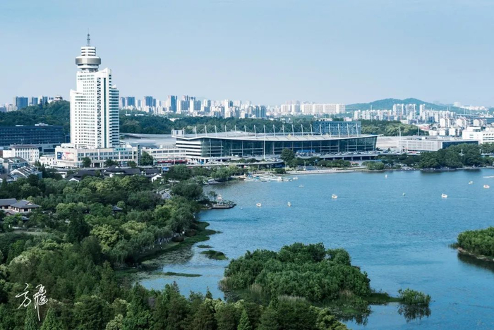 ▲ 前面是心形的莫愁湖,后面是繁华的新街口。摄影/熊伟