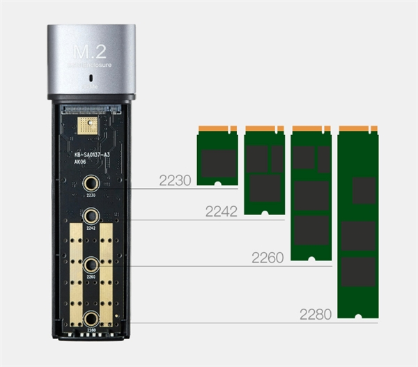 支持2230/2242/2260/2280四种不同大小的硬盘,采用智微JMS576主控芯片,高速传输,具有静电保护功能,避免短路烧坏硬盘。