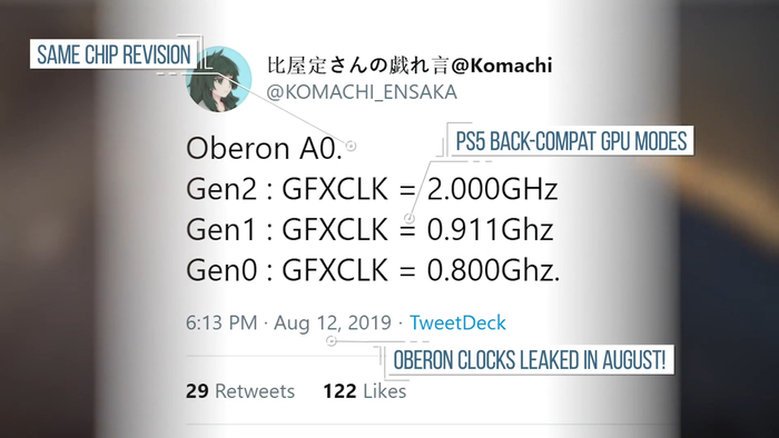 那么DF是怎么确定Oberon就是PS5芯片的呢?他们提到了在测试数据中,Oberon上面的GPU存在着多种模式——"native"、"Gen 0"、"Gen 1"和"Gen 2",其中"native"和"Gen 2"模式下面,这枚GPU开放所有CU,并工作在2.0GHz下面。而在Gen 0和Gen 1模式下面,它将降低频率,同时还可能会关闭部分单元,比如在Gen 1模式下面,它将以911MHz的频率工作,并且此时的显存带宽降低到了218GB/s,这个规格与PS4 Pro上面的GPU是一致的。同样的,Gen 0模式下,这枚GPU“模拟”成了PS4的样子。