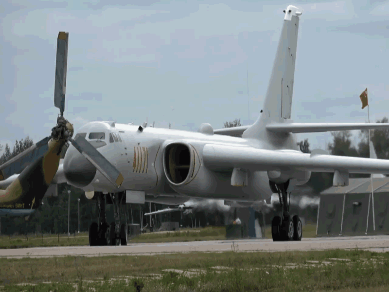 比赛期间,难得出现了中俄两军战机的同框画面。图为参赛的中国空军歼轰-7、俄军图-22M3轰炸机起飞以及苏-34战斗轰炸机编队释放热焰弹动态图。