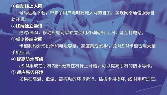 eSIM,简单来说,就是电子化的SIM卡,不同于原来的“烧号”,专门的eSIM芯片更加安全智能。eSIM技术带来三大变革,一是卡槽去除,带来了终端设计的自由,同时,由于芯片内嵌于设备之中,可以全面提升防水、抗震性能;二是号码远程下载,带来用户随时随地入网的自由;三是eSIM的多场景化,使泛智能终端接入更为便捷,带来了万物互联应用的更多可能。