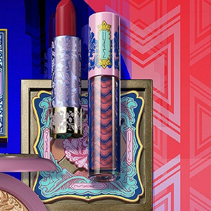 在具体单品上,这一系列包含了四款唇釉、一款粉饼、一款九色眼影盘、四款口红和一款荧光盘。唇釉和唇膏系列延续了传统宫廷装饰中对庄重效果的追求,其中的大红色、暗紫色、深橘色非常适合用于镇住大场面。如果你想要追求轻快的效果,唇釉系列中的亮紫色和浅黄色会是不错的选择。