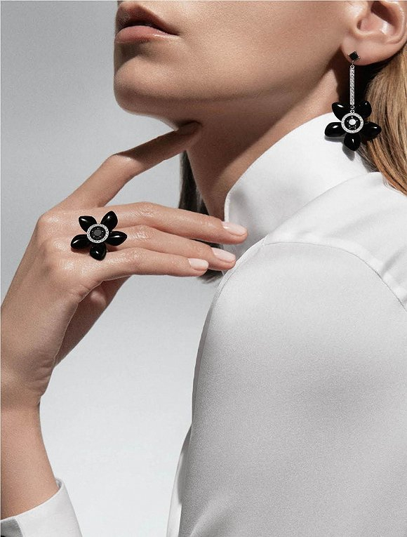 但迟来并不意味着低质,这一包含五十多件单品的系列延续了Giorgio Armani本身在服饰设计上坚持的“简单而现代”理念,用金、银以及多种色彩淡雅宝石的搭配来营造出柔和的女性形象。整体珠宝的造型趋于极简,设计师巧妙地用圆形的品牌logo作为装饰点缀,在流动的线条中显现出别具一格的效果。大量花朵图案的运用是这一系列中的另一亮点,设计师别出心裁地选用黑色钻石来打磨花瓣廓形,并用闪烁白钻石和纯银作为映衬,打破了黑色的肃穆感觉,整体显地非常清丽。
