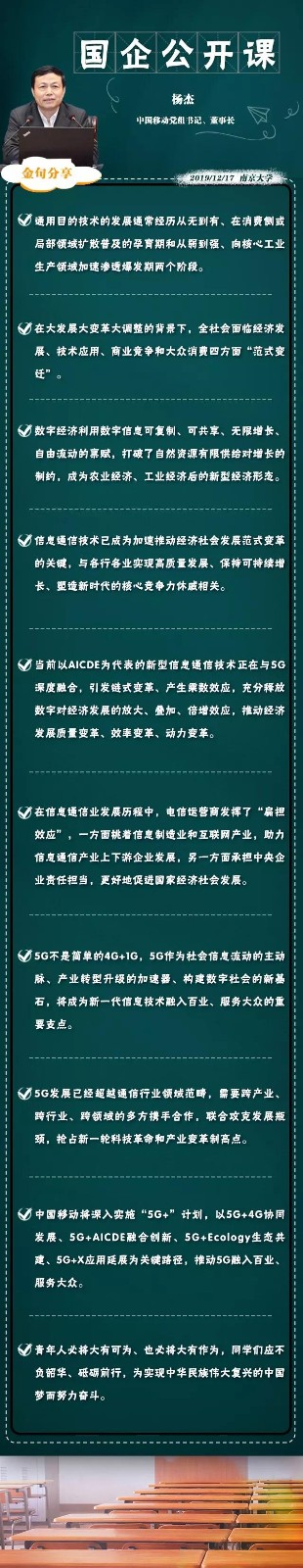 在报告中,杨杰从“新技术在文明演进中的作用”“信息通信业发展历程和成就”“5G技术及对经济社会的影响”“中国移动在新时代的新使命”四个方面,与在场学生展开交流。
