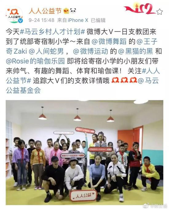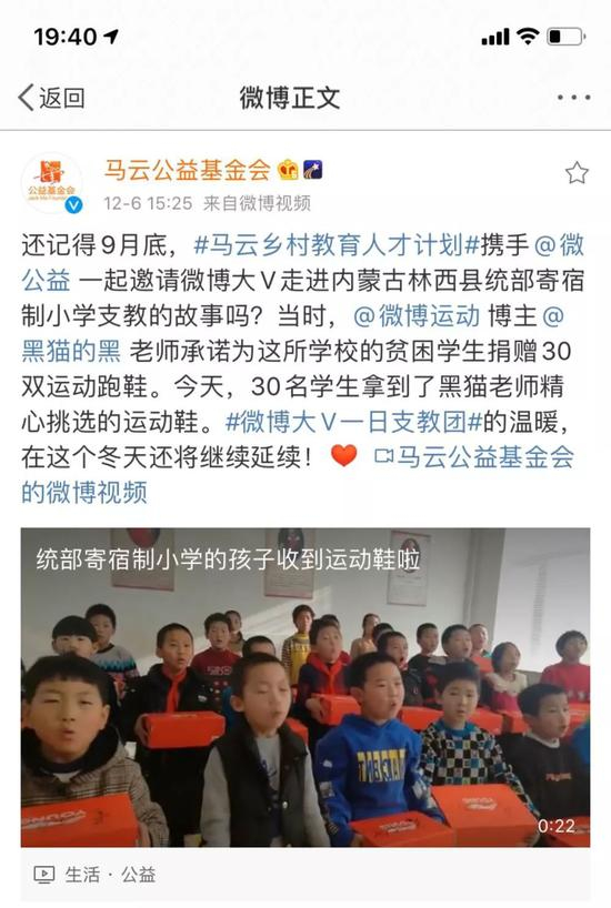 三期线下活动,#微博大V一日支教团# #马云乡村教育人才计划# #马云乡村人才计划# 3个话题词累计阅读增量近9000万。而支教团成员在授课和参观中感触颇深表示将来会更深入支持马云公益基金会及相关公益项目。@黑猫的黑 自愿为该校学生捐赠30双过冬跑鞋。