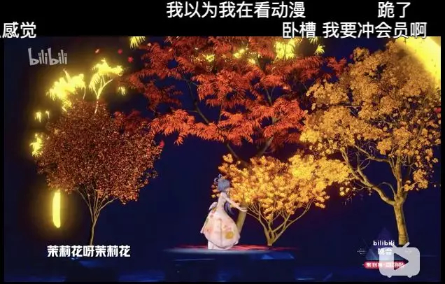 在舞台审美上,除了常见的晚会舞台布景灯光之外,也加入独特的二次元唯美场景,最经典的比如国乐大师方锦龙跟虚拟偶像洛天依跨次元合奏《茉莉花》,有弹幕评论为“爷孙卖艺组”,还在现场做出了下一次跨年的组合承诺。