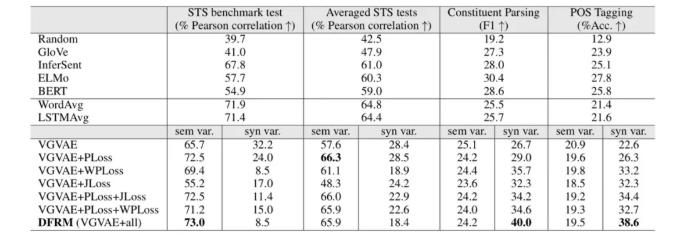 表1给出了不同模型在语义和语法任务上的不同表现。实验结果表明,我们提出的解纠缠特征表示模型(DFRM)可以最大限度的区分句子中语义和语法信息,在语义和语法相似性数据集上取得了最好的结果。