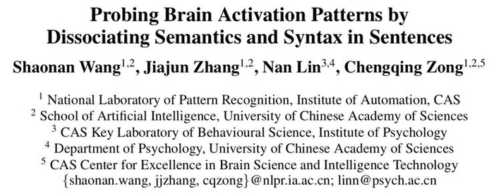 Shaonan Wang, JiajunZhang, Nan Lin and Chengqing Zong. Probing Brain Activation Patterns byDissociating Semantics and Syntax in Sentences. The Thirdy-Fourth AAAIConference on Artificial Intelligence, Feb. 7-12, 2020, New York, USA.