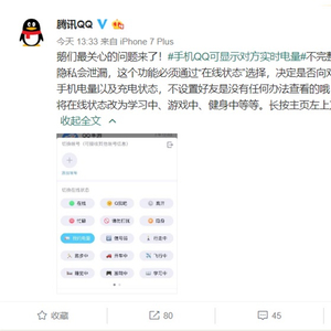 腾讯称,“大家不用担心隐私会泄漏,这个功能必须通过“在线状态”选择,决定是否向对方实时显示自己的手机电量以及充电状态,不设置好友是没有任何办法查看的哦!”