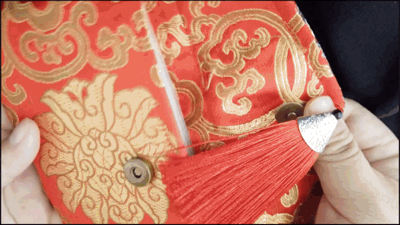 纸币搭配的红包,采用了绸缎刺绣流苏袋,祥云与流苏描绘着如花似锦的未来,加上金线工艺的点缀。