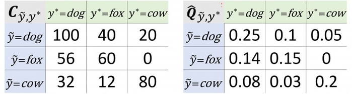 1、将联合分布矩阵乘以样本数。假设我们的数据集中有100个样本。所以,在上图中(右边的Q矩阵)有10个标记为狗但实际上是狐狸的图像。