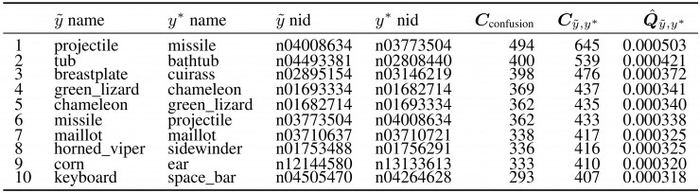 CL 通过直接估计标签噪声的联合分布,自动发现数据集中类的本体问题。在上表中,我们展示了在 ImageNet 单类数据集的估计标签噪声联合分布时的最大偏离对角线。每行列出了噪声标签、真实标签、图像 id、统计数量和联合概率。因为这些是偏离了对角,所以噪声的类别和真实类别应该会是不同的,但实际上是在第 7 行中,我们看到 ImageNet 有两个不同的类,它们都被标记为“maillot”。