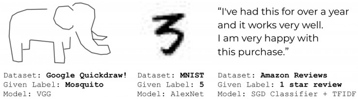 Amazon Reviews、MNIST和QuickDraw数据集中当前存在的标签错误示例,由面向不同数据形式和模型的置信学习确定。