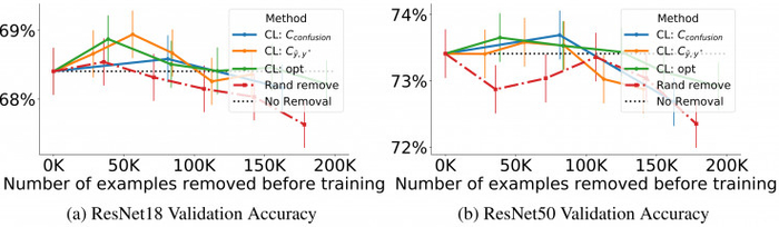 使用CL在清洗后的 ImageNet 训练集上训练(不添加合成噪声),当移除小于十万个训练样本时,观察到使用ResNet时验证精度得到提高;当大于十万个训练样本被移除时,观察使用CL清洗后的数据与随机移除样本的结果相比相对有所改善(如图红色虚线所示)。
