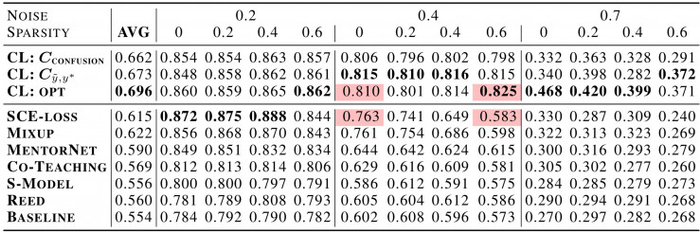 如上表中突出显示的单元格所示,与 Mixup、MentorNet、SCE-loss 以及 Co-teaching 等最新方法相比,CL 较为显著地增强了对稀疏性的鲁棒性。这种鲁棒性来源于对模型 Q 直接建模,即噪声与真实标签的联合分布。
