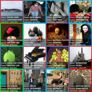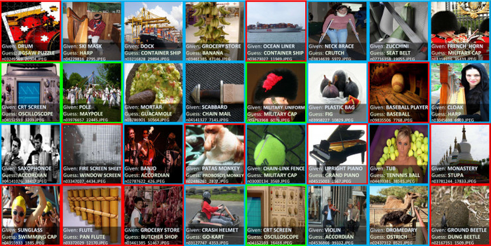 图为2012 ILSVRC ImageNet训练集中使用信心学习确定的前32个标签问题。其中红色方框表示标签误差,绿色方框表示本体问题,蓝色方框表示多标签图像。