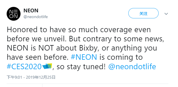 在CES 2020还没有开始之前,Neon就已经引起外界的关注。尽管存在-也许是由于-没有人真正知道它是什么的事实。Neon12月中旬启动其社交媒体帐户后在Twitter上发布了几条预告片,暗示它被称为“人工智能”。关于Neon的唯一具体事实是它由三星研究主管Mistry负责,后者于10月被任命为STAR Labs的首席执行官。