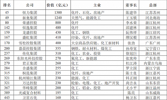 入选《2019胡润中国500强民营企业》榜单的化工类企业。