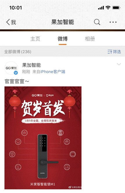 今天上午10:00,果加官方微博毫无征兆的突然官宣,果加米家版智能门锁M1首发上市。这款万众期待的产品,以它特殊的身份,在岁末年初之际,终于粉墨登场,仿佛就是给用户准备的一份新年礼物。