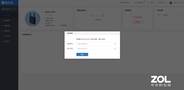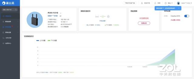再次进入系统后,会自动进入系统主页。在主页上,共有五大主要模块。头部的四个模块分别展示了R300现在的运行状态、网络连接状态(有实时网速显示)、智能组网及WiFi设置。下方的图表则根据时间段展示了实时网络状态,帮助用户更好的统计流量高峰和低谷时间段。左侧功能栏提供了6大功能,用户点击相应功能,主页则会切换到相应功能页。