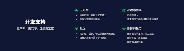 在开发支持上,微信从云开发、开发社区、小程序框架、服务商生态四大板块做了升级。在运营服务上,为了提升商业交易基础体验,微信也提供了相对应的运营工具:加急审核、运营中心和运营分。
