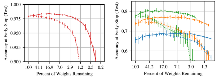 在不同的剪枝率下测试中奖彩票子网络(实线)与随机采样子网(虚线)的准确性(Frankle&Carbin,2019)。
