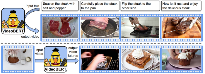 VideoBERT(Sun等人,2019年),一种最新的BERT多模态变体,根据配方(上面)生成视频“令牌”,并根据视频令牌(下面)预测不同时间尺度的未来令牌。