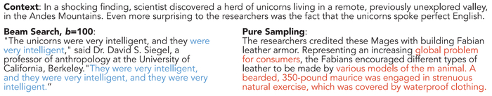 GPT-2使用光束搜索和纯(贪婪)采样产生的重复(蓝色)和胡言乱语(红色)(Holtzman等人,2019)。