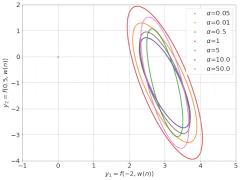 具有不同 α 因子的 NTK 线性模型的动态学习过程, NTK 可视化为椭圆形(来源:Rajat的博客)。