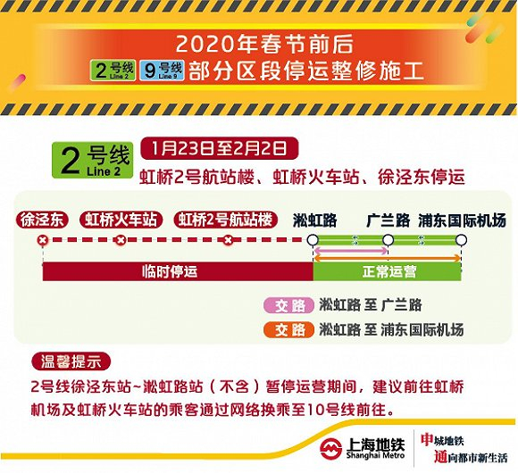 受施工影响,2020年1月23日至2月2日(共计11天),地铁2号线徐泾东站~淞虹路站(不含)暂停运营,2号线运营交路临时调整为“淞虹路站~广兰路站∕淞虹路站~浦东国际机场站”大小交路;2号线常态末班车后的定点加班车取消;在此期间逢周五、周六,除徐泾东站~淞虹路站(不含)外,2号线其他车站仍执行周五、周六延时运营方案。