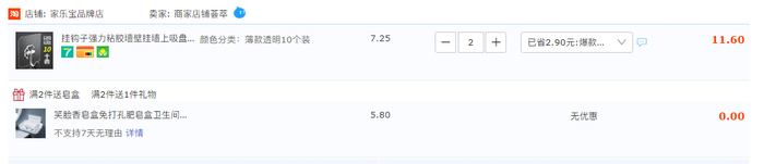 任意下单满2件,再送5.8元免打孔肥皂盒1个,更实惠。