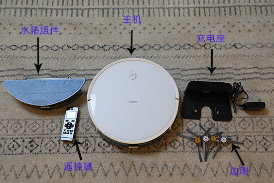 扫地机器人包装箱内有一台主机,一个充电座,边刷、一个水箱一个尘盒、遥控器还有高效滤网以及拖布等,这就是这款扫地机器人的全部家当了。