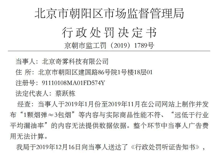 行政处罚决定书显示,北京奇雾科技有限公司于2019年1月份至2019年11月在公司网站上制作并发布“1颗烟弹≈3包烟”等内容与实际商品性能不符、“远低于行业平均漏油率”的内容无法提供数据依据。整个环节中北京奇雾科技有限公司广告费用无法计算。