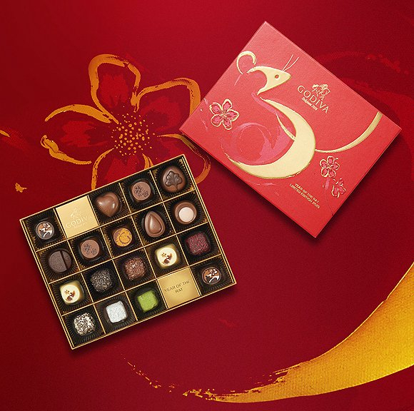 GODIVA在今年的新春巧克力礼盒上用简简几笔画了一只金鼠,并在内部装载了柠檬慕斯白巧克、香脆碧根果仁与牛奶巧克力和黑巧克力等多款甜品,非常适合在过节期间与亲朋一起品尝。