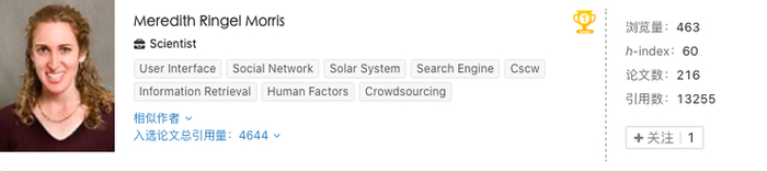 人机交互领域排名第一的是微软科学家Meredith Ringel Morris,这也是所有20个领域排名第一的唯一一位女性科学家。在这一领域中,很遗憾,也鲜少有华人身影。
