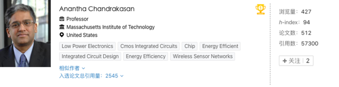 这一领域,MIT的Anantha教授排名第一,紧随其后是著名华人学者丛京生,而清华大学教授汪玉、杨华中也分别排名第 9 名和第 10 名。值得注意的是刚刚入选ACM Fellow的阿里巴巴达摩院著名学者谢源排名第 34 名。