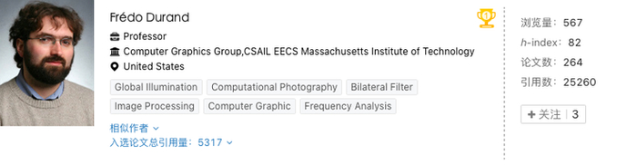 MIT的Frédo Durand排名第一。华人中排名最高的是西蒙弗雷泽大学大学的张皓教授(13),其次是浙江大学周昆教授(22)、清华大学胡事民教授(23)、微软亚研郭百宁博士(30)、微软亚研童欣博士(31)、北京大学陈宝权教授(32)。
