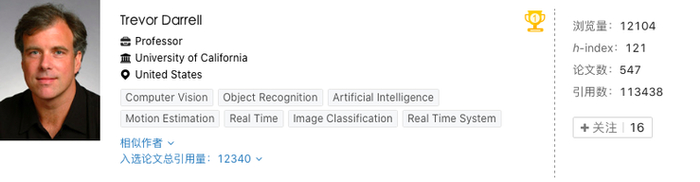 加州大学Trevor Darrell教授排名第一。在这一领域,著名青年学者、阿里副总裁贾杨清位列第二名(共有7位并列第二),依图CTO颜水成排名第 12名。值得注意的是,这一领域也是华人扎堆的领域,排名前 100名的学者中 70%的都是华人。