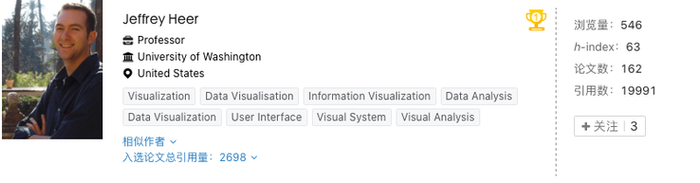 可视化领域的第一名是华盛顿大学的Jeffrey Heer教授。香港科大屈华民教授和清华大学刘世霞教授分别排名第 3 名和第 4 名。浙大巫英才教授、北大袁晓如研究员、浙大周昆教授也分别排名第 15、20、22名。