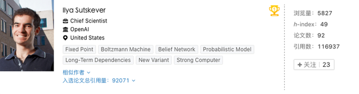 Ilya Sutskever教授以入选论文总引用量92071 排在机器学习领域第一名。而著名学者Geoffrey Hinton则以70250排名第二,Yoshua Bengio以55930排名第三。Ian Goodfellow 和Jeffrey Dean分别排名第 7名和第 10 名。在机器学习领域的前十名中,没有华人出现。