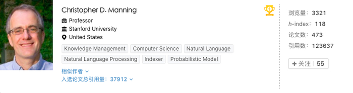 自然语言处理领域,Manning 以入选论文总引用量 37912,当之无愧的排在第一名。Yoshua Bengio和吴恩达(Andrew Y. Ng)分别排在第 4 和第 6 名。曾有一位学者警示说“NLP的研究仍然是白人占统治地位”,从排名中可以看出,此言不虚,在排名前 100的学者中,亚裔身影寥寥无几,国内NLP领域最著名的学者何晓东、周明、刘挺等人榜单排名也仅在30多名。