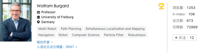 Freiburg大学的Wolfram Burgard以入选论文总引用量9597排名第一。机器人领域鲜少有亚裔身影,前10名(甚至前20名)都没有亚裔身影。可见我们需要提升的空间还很大。
