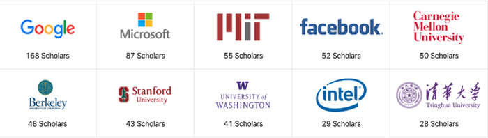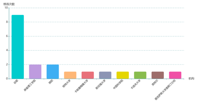 位居首位的是谷歌公司,共 168 人入选榜单,也是唯一一家学者数过百的机构。从国家分布来看,只有清华大学为中国入选机构,其余均为美国研究机构,且美国机构学者总体人 数遥遥领先。此外,各领域榜首机构统计如下图所示。