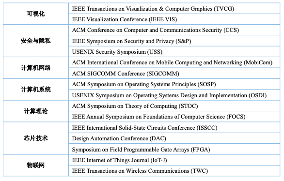 每个子领域所参考的顶级会议和期刊是根据《CCF 推荐国际学术期刊和会 议目录》和 ACM 计算分类系统相关子领域的 A 类期刊和会议作为数据的来源。然后征求相关专家和团体意见,补充新涌现的学科顶级期刊和会议。以下列表给 出了 20 个子领域所采用的顶级会议和期刊。