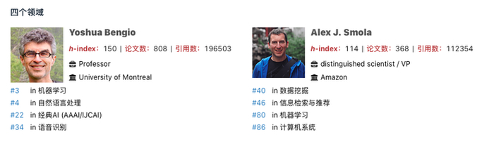 AI 2000的学者中,有多位学者的研究方向涉及了多个领域,其中有2位学者出现在四个领域,他们分别是Yoshua Bengio以及Alex J. Smola;此外,有20位学者出现在三个领域,有117位学者出现在两个领域。
