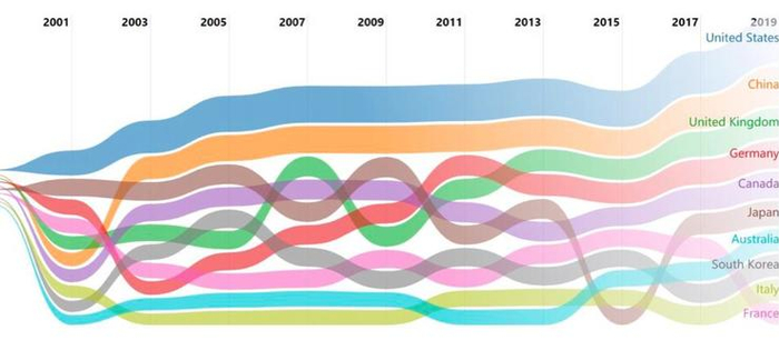 图中每条色带表示一个国家,其宽度表示该国家在当年的研究热度,与当年该国论文数量呈正相关,每一年份中按照其热度由高到低进行排序。通过国家趋势分析可以发现热度 TOP10 的国家分别是:United States(美国)、China(中国)、United Kingdom(英国)、Germany(德国)、 Canada(加拿大)、Japan(日本)、Australia(澳大利亚)、South Korea(韩国)、 Italy(意大利)、France(法国)。当前研究热度最高的国家是美国,从全局热度来看,美国早期就有着领先优势并一直保持着最高的热度,同时中国的研究热度紧随美国之后。